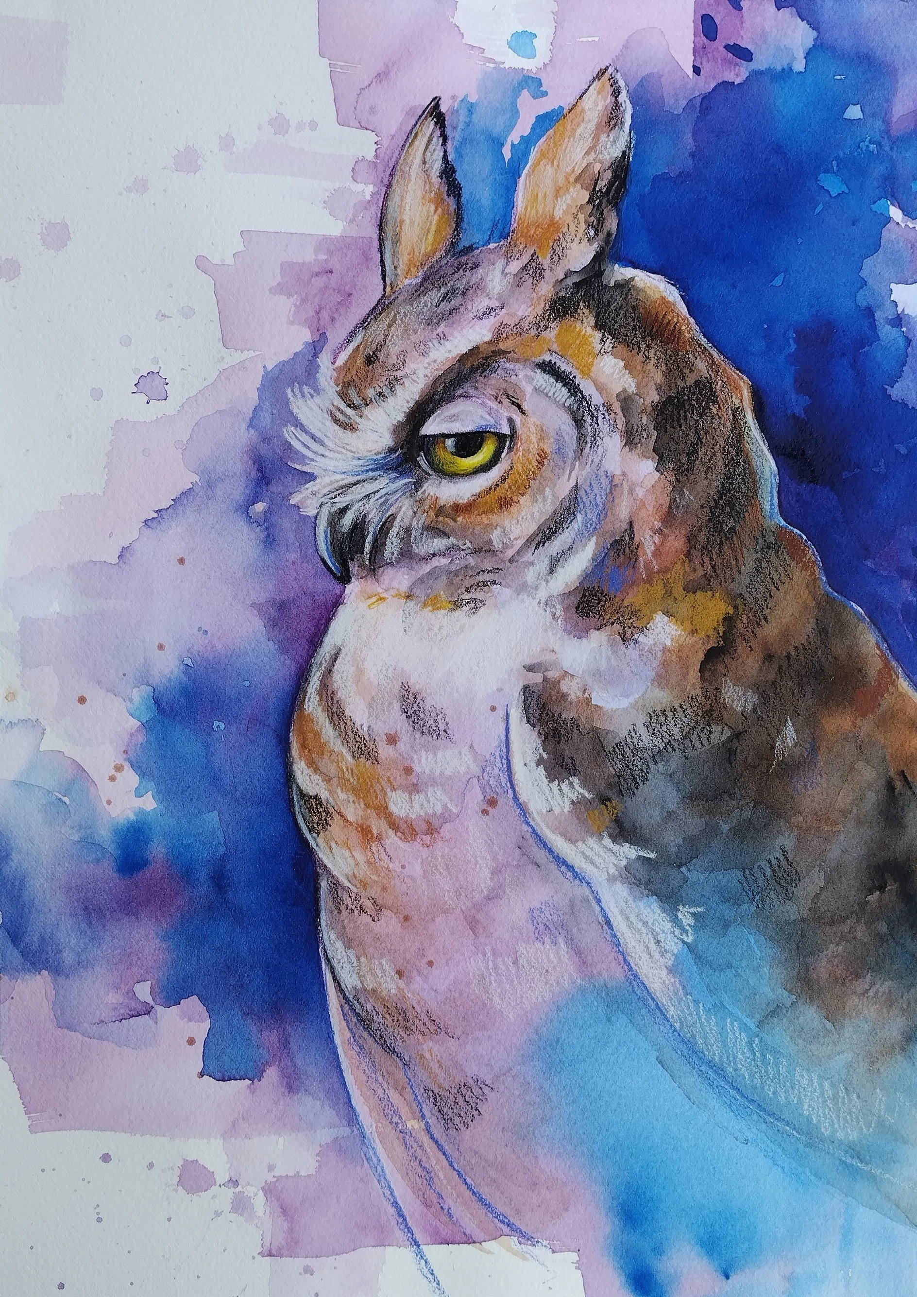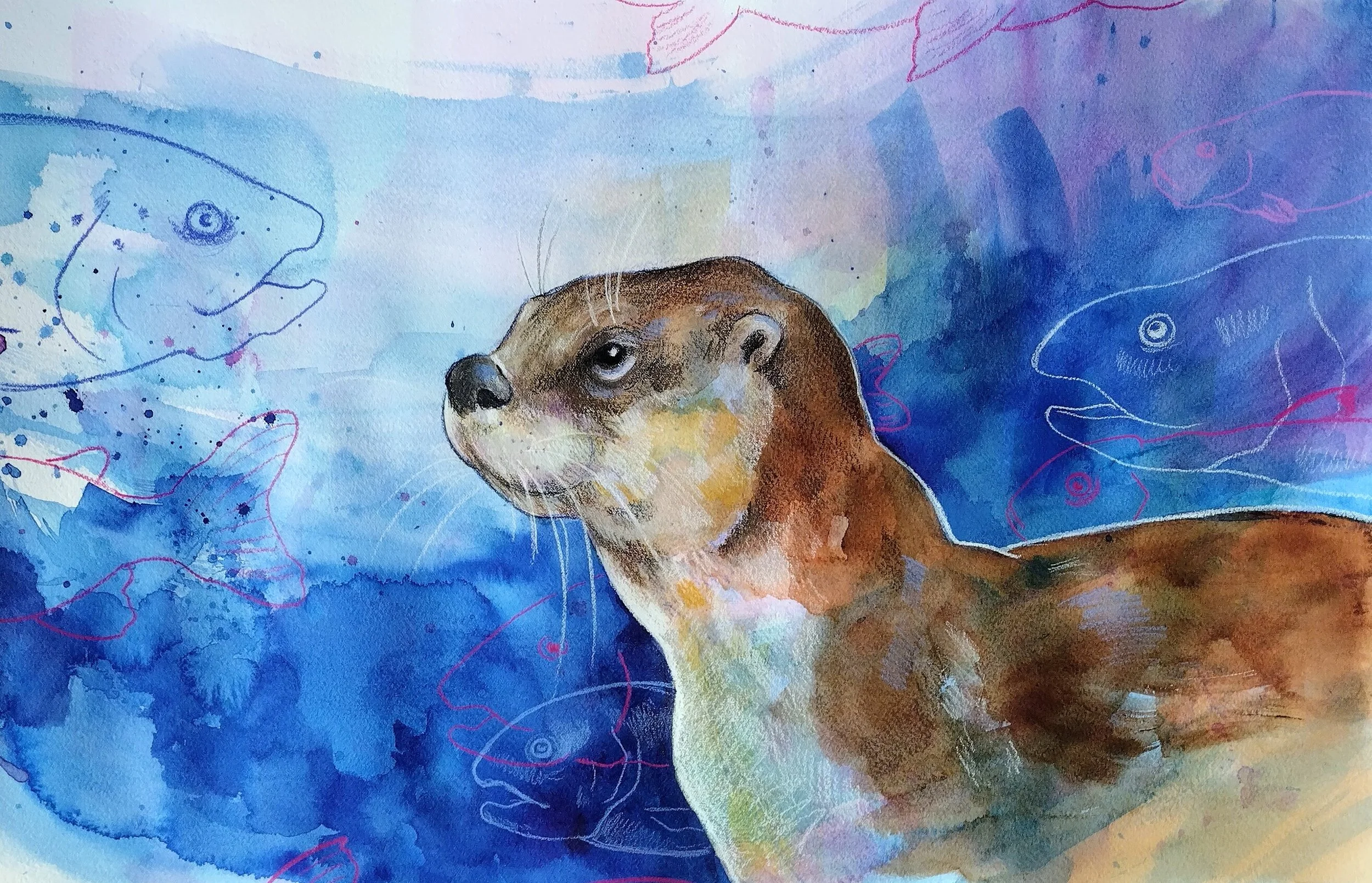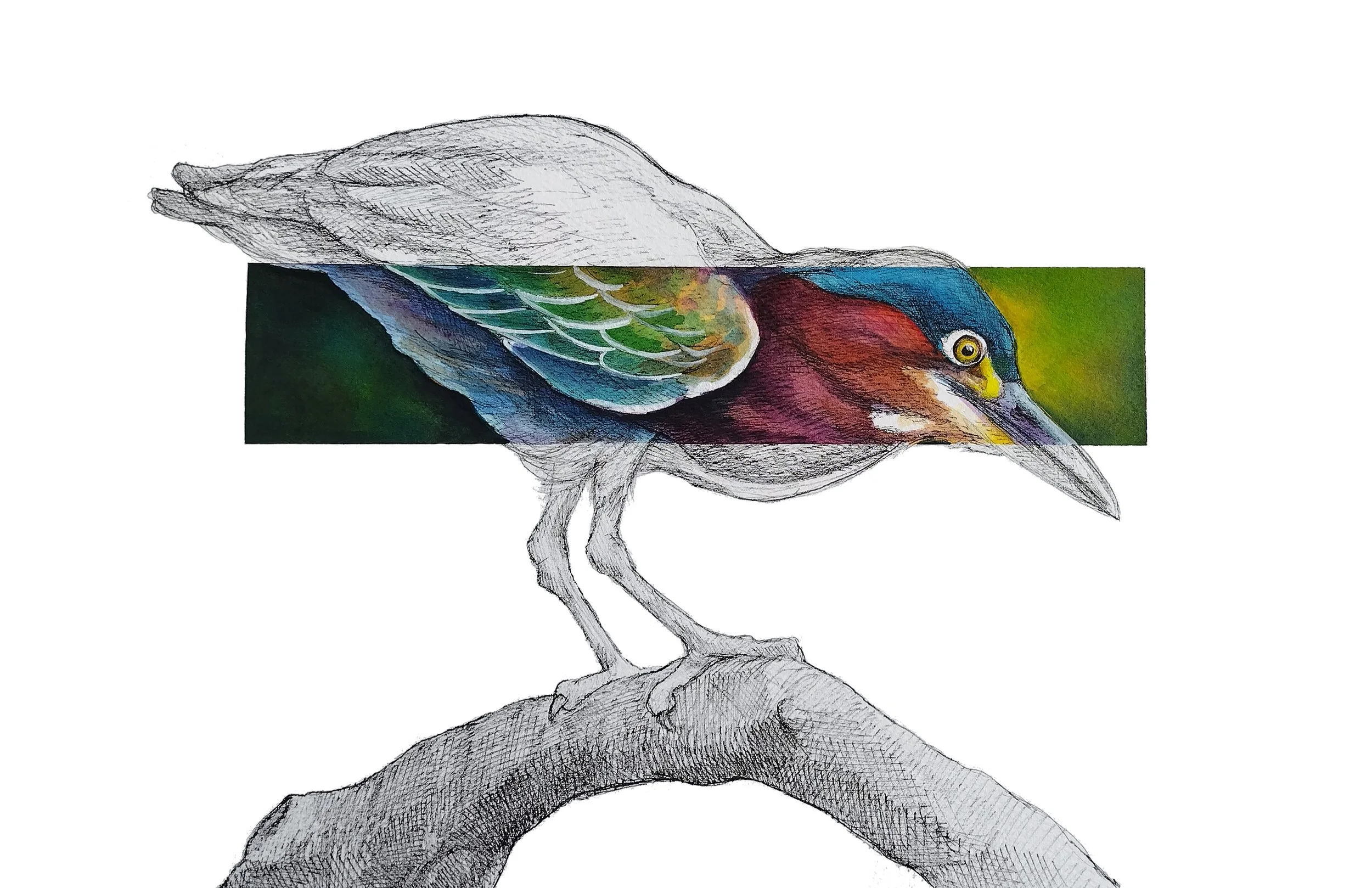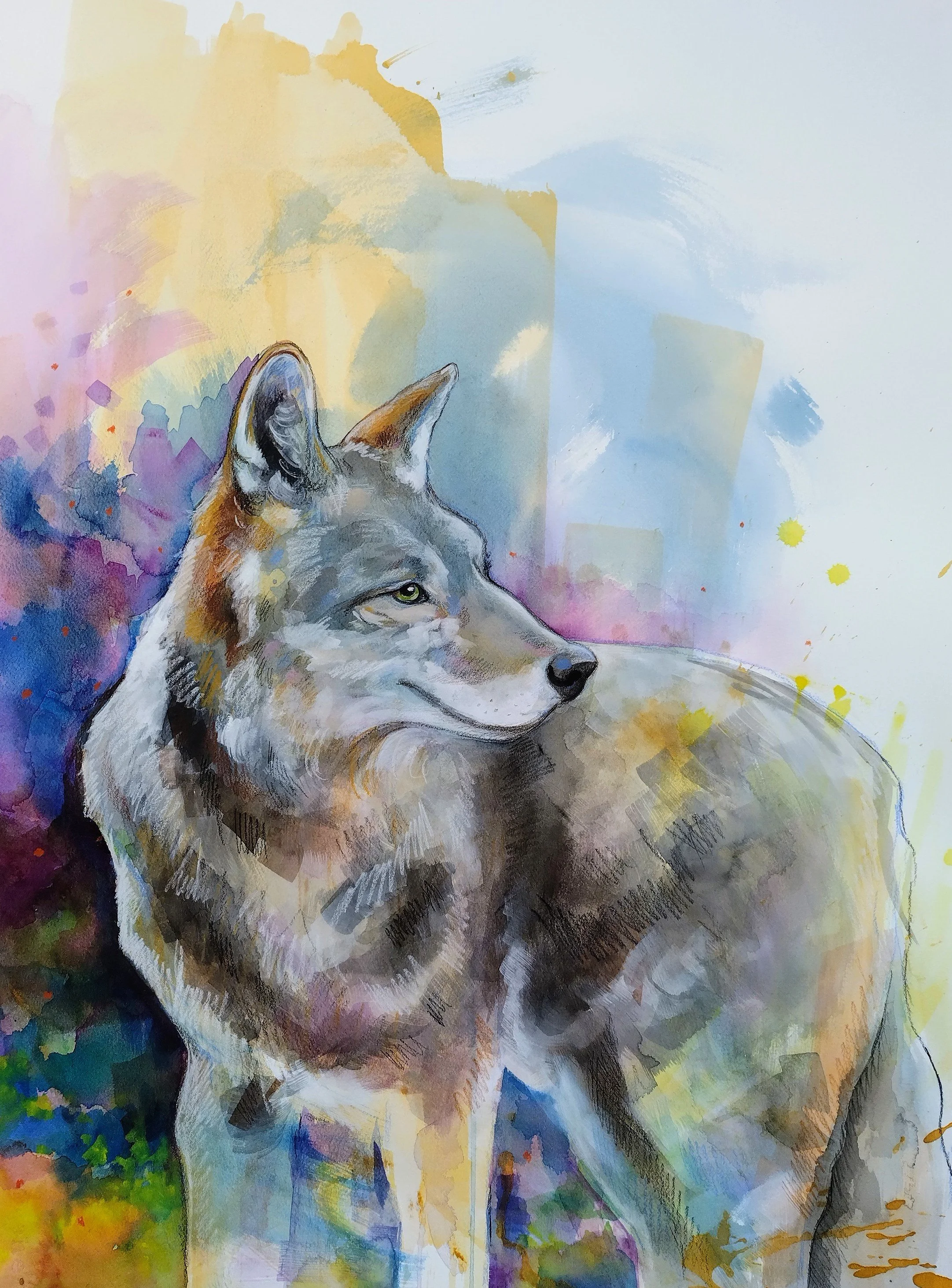 This is my newest collection forming in 2026. It is so much fun! It has been wonderful to pay with color, splatter, and imperfections. I create an abstract base and then use colored pencil to work in the wildlife as a top layer. Play is the whole point of this joyful collection.