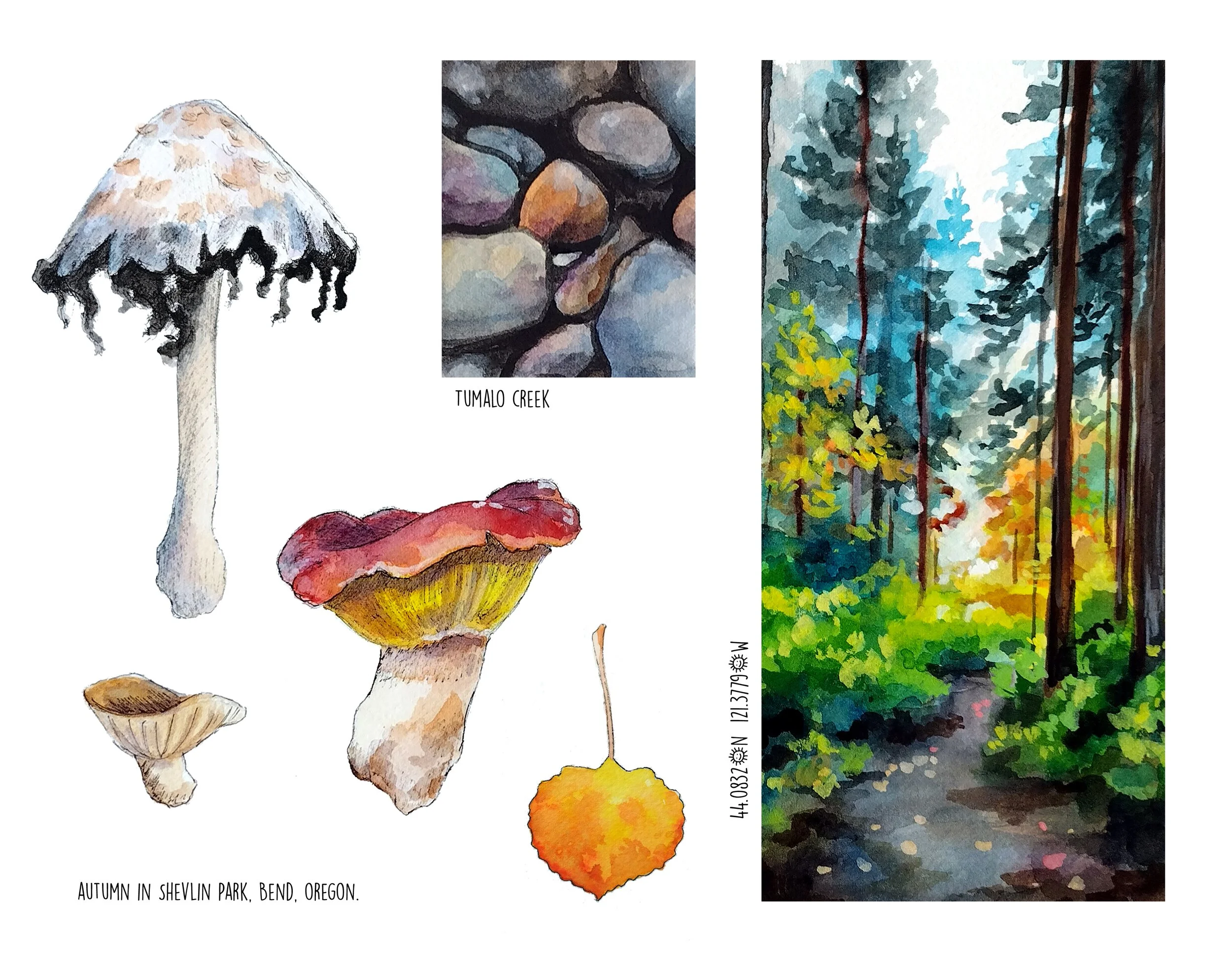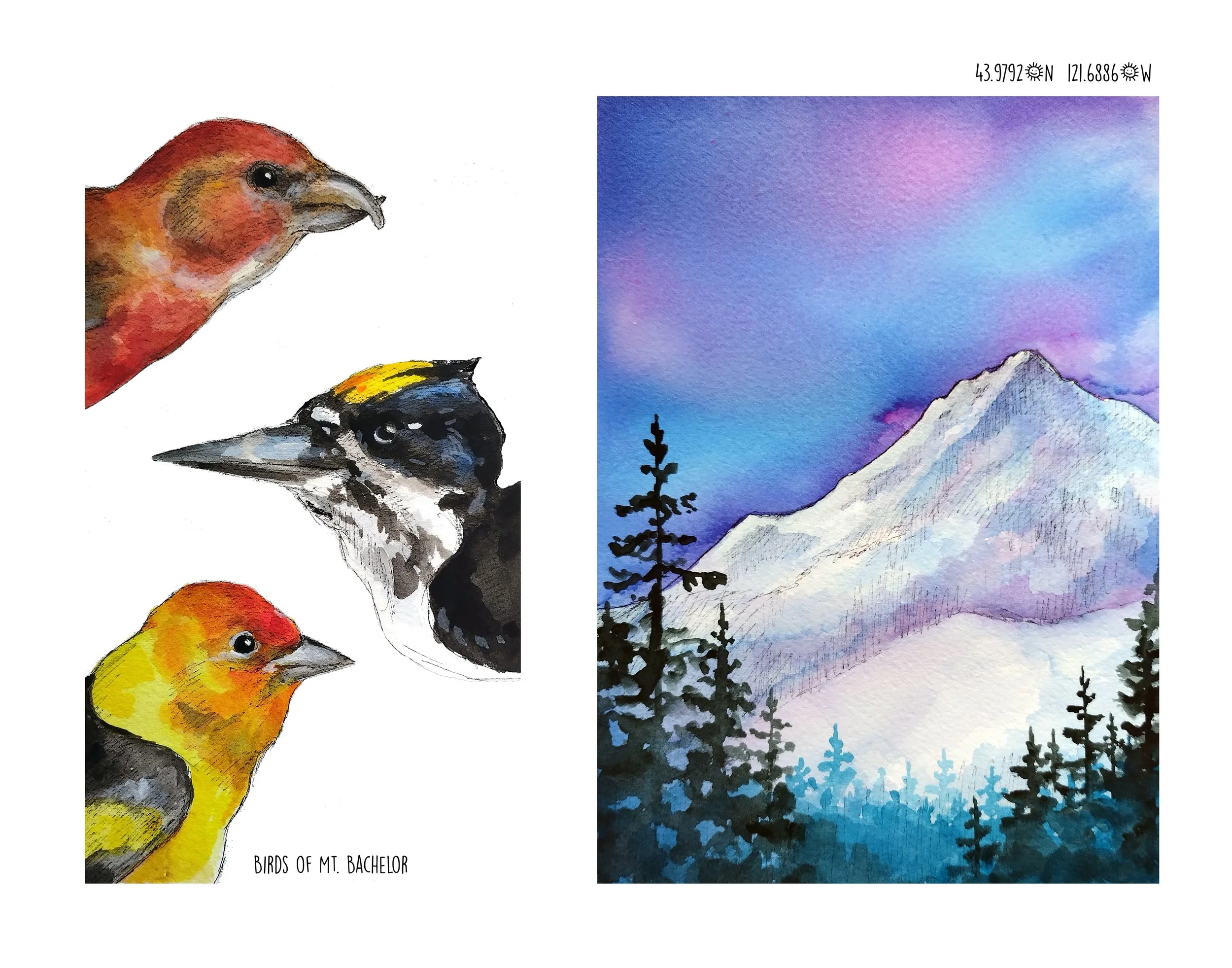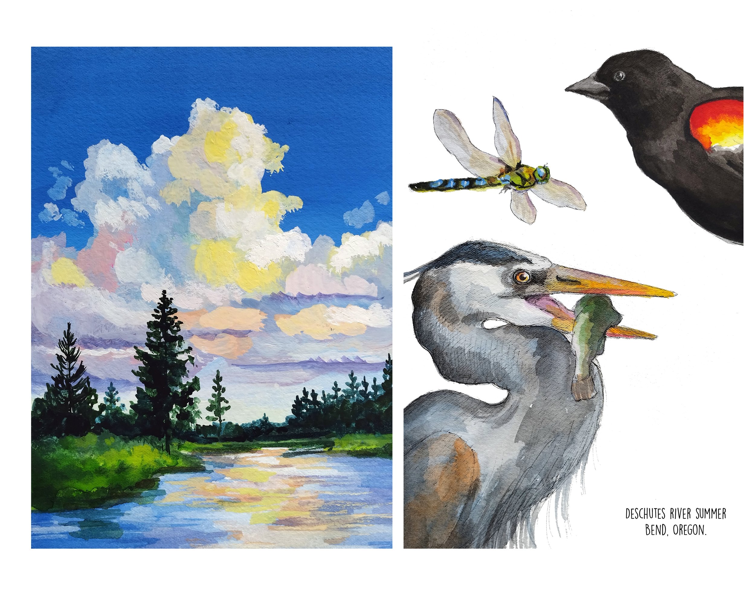 Somewhere around the end of 2025 I became really into sharing my love of nature journaling through these larger artworks. They combine my love of landscapes with my love of painting birds and other wildlife. I enjoy playing with page layouts, and things like fish color swatches. This collection is ongoing and so much fun.